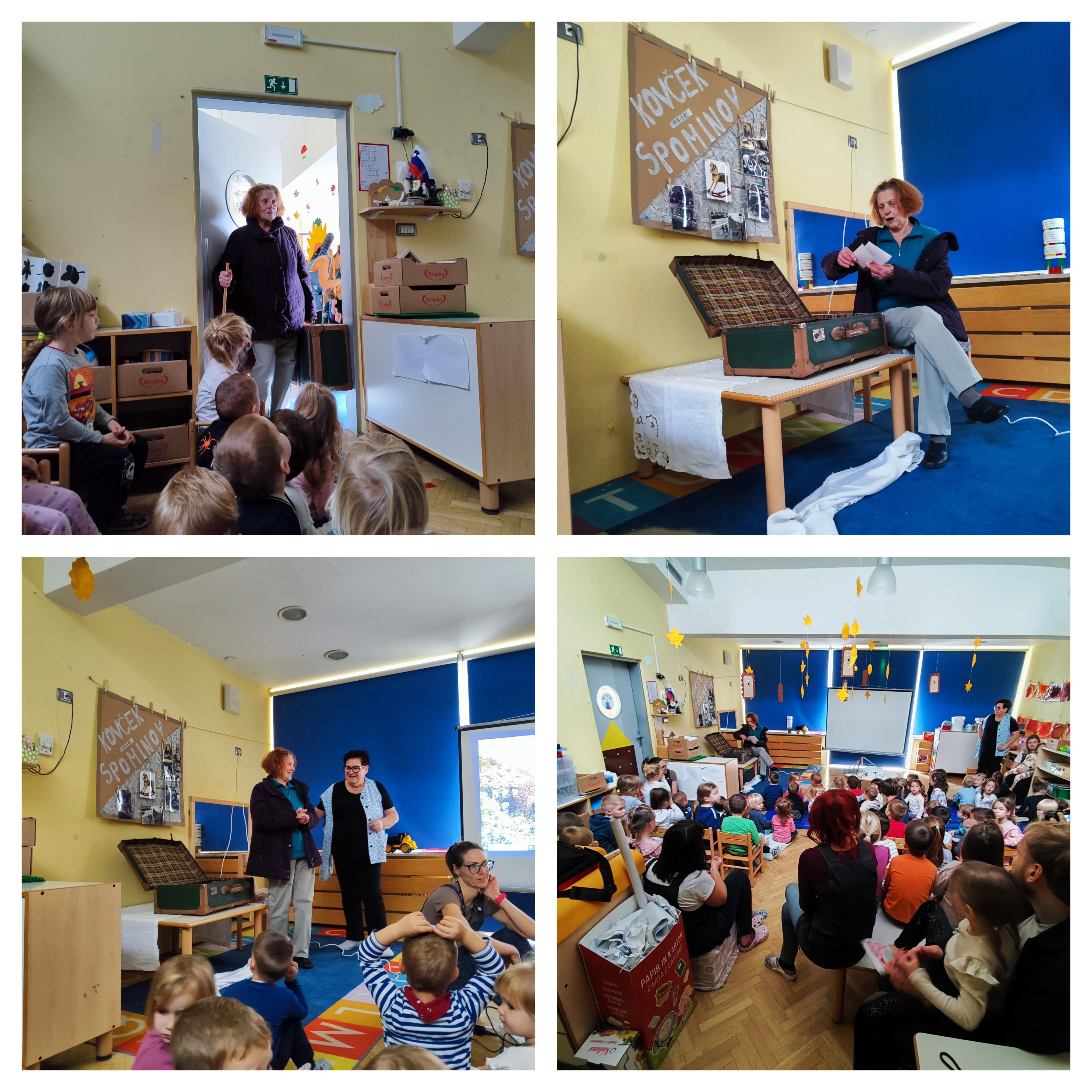 Kovček nam je prinesla gospa Polda, ena prvih vzgojiteljic v vrtcu Polžek Šalara. Z nami je čustveno delila svoje spomine ter povedala, da se je v vrtcu skozi leta marsikaj spremenilo, vendar so lepi trenutki tisti, ki ostanejo. Po njenem pripovedovanju nam je vzgojiteljica Hermina ob projekciji na platnu predstavila zgodbo z naslovom Kovček (Daniela Sosa).