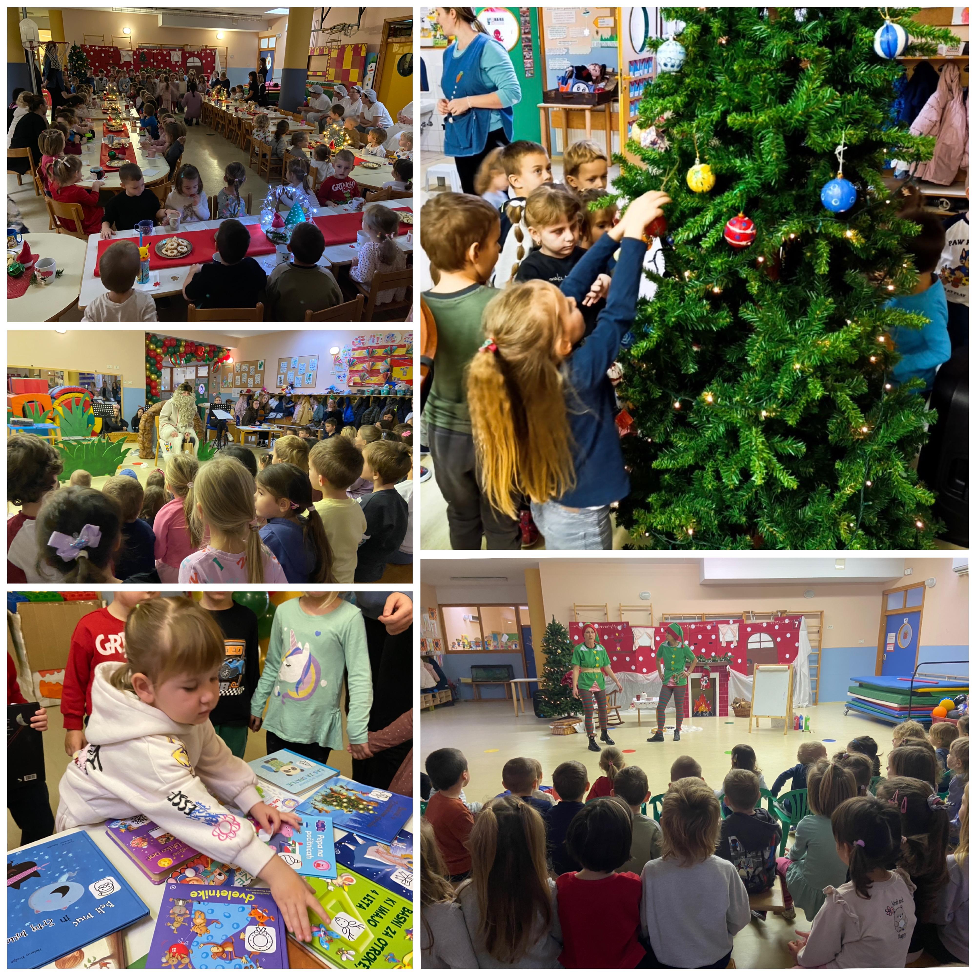 V praznični december smo vstopili z druženjem v našem večnamenskem prostoru, kjer smo okrasili našo jelko velikanko, se naučili pesmico o Dedku Mrazu ter mu napisali pismo. Ogledali smo si tudi dramatizacijo Miška si želi prijatelja, ki so jo pripravile študentke Pef, ter nestrpno pričakovali prihod Dedka Mraza.